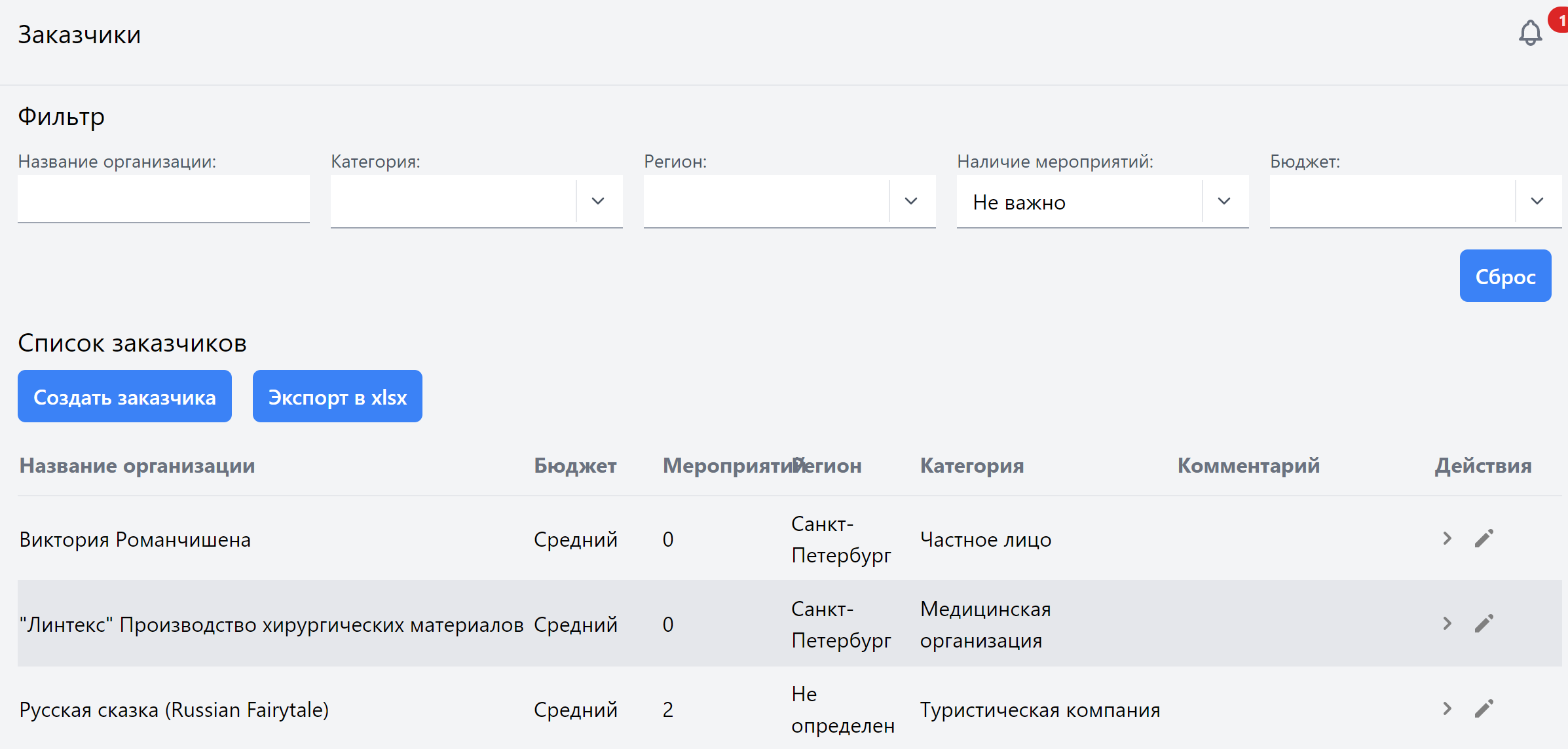 Раздел "Список заказчиков" содержит таблицу с отображением всех заказчиков, существующих в системе, с возможностью фильтрации по Названию,Имени контактного лица, Категории, Региону и Бюджету. Для просмотра детальной информации о заказчике в колонке «Действия» нажмите на иконку ">". Также доступна выгрузка списка заказчиков в формате xlsx таблицы