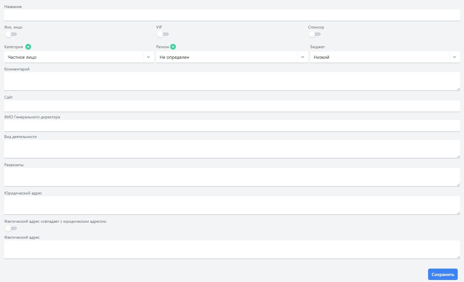 Дополнительно доступна кнопка "Сохранить и создать мероприятие", которая в случае успешного сохранения переадресует на создание мероприятия с подставленным текущим заказчиком
