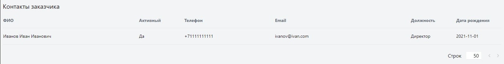 Для редактирования заказчика нажмите на кнопку в разделе "Список заказчиков", основная часть формы полностью идентична форме создания заказчика. В нижней части страницы представлен инструментарий для управления контактами заказчика.