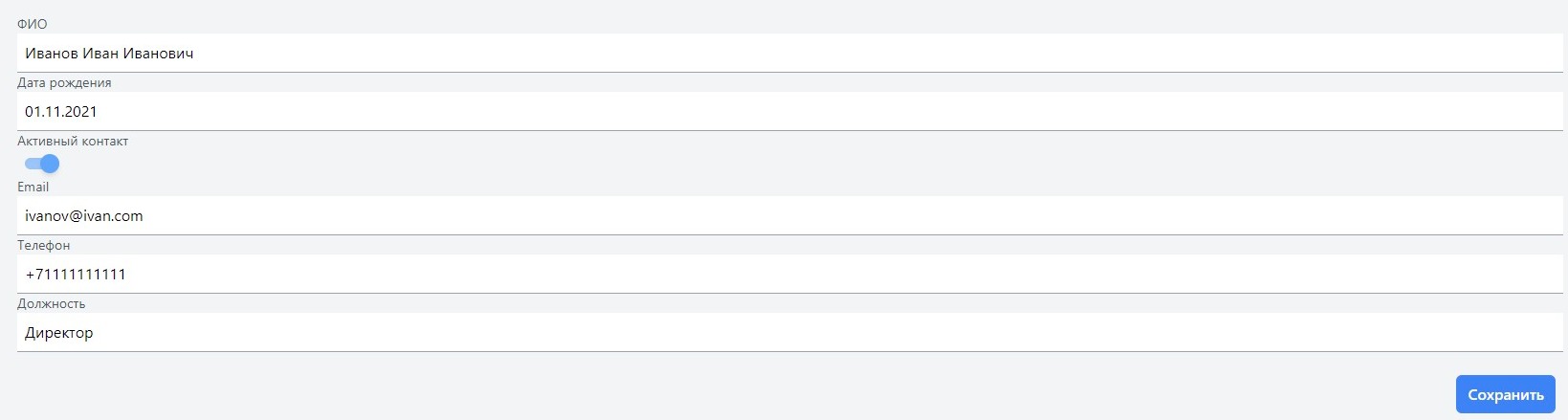 Управление контактами доступно в форме "Редактирование заказчика". Для создания нового контакта нажмите кнопку «Создать контакт». Для того чтобы перейти к редактированию уже добавленного контакта - нажмите кнопку в колонке «Действия». Формы создания и редактирования контакта полностью идентичны.