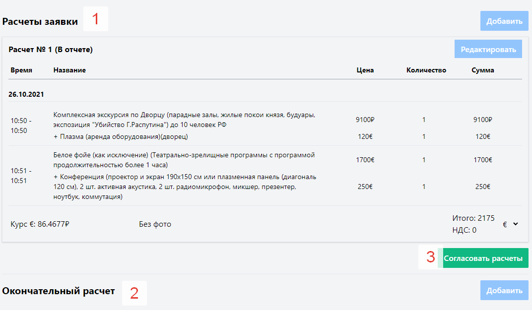 Окончательный расчет. Одобренные расчеты, соответствующие реальному мероприятию.