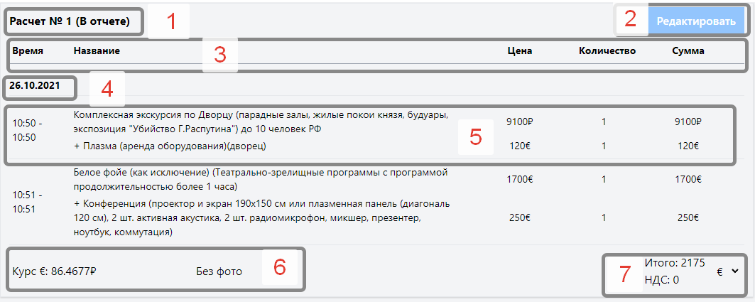 - Итого -- сумма, включающая в себя все пункты расчета, стоимость фотографирования, и НДС, отображается в выбранной валюте