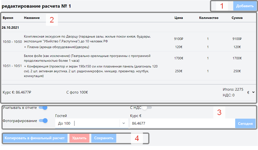 Cодержит формы расчета стоимости мероприятия. Каждый расчет редактируется независимо от прочих.