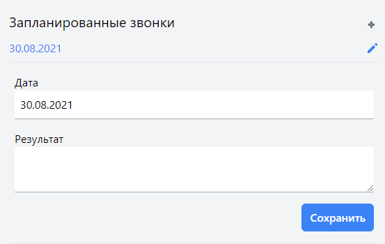 Встраивает поле с датой на которую планируем звонок, форма закрывается либо повторным нажатием на «+», без сохранения, либо кнопкой «Сохранить» с сохранением.