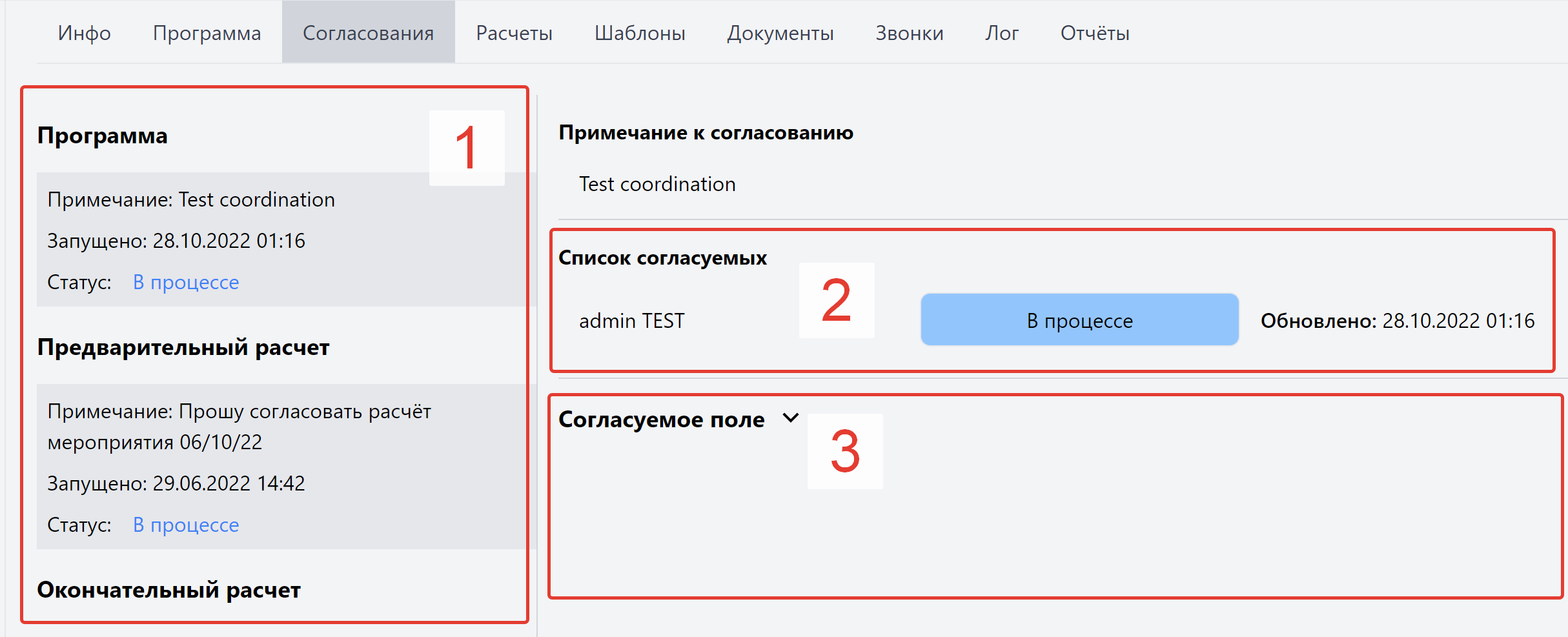 Содержит актуальную информацию о согласованиях, относящихся к мероприятию. В данном разделе доступен только просмотр.