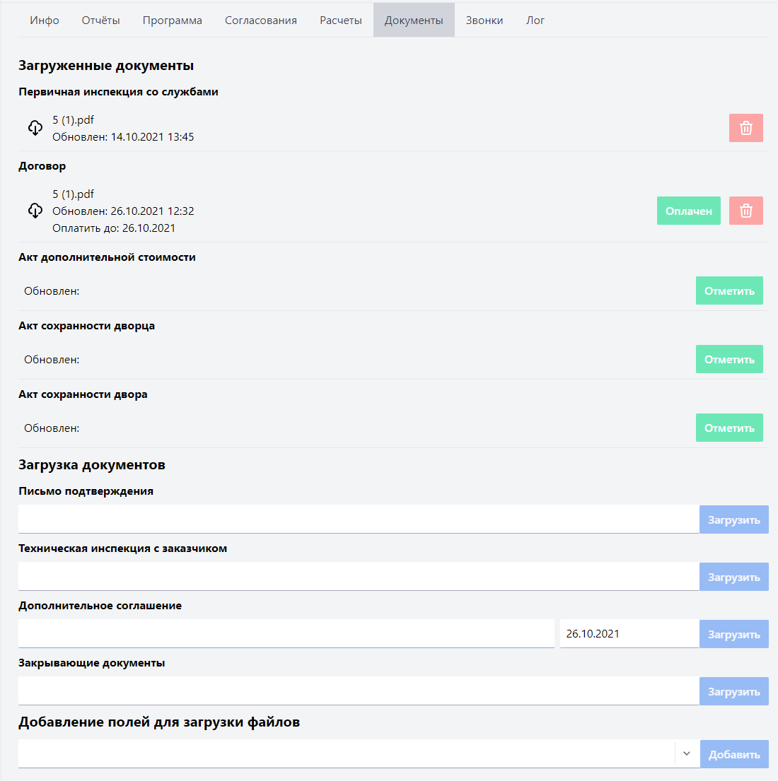 Загрузка документов - содержит базовый список документов необходимых для загрузки при нормальном цикле работы с мероприятием, а также форму добавления полей для загрузки, позволяющую добавлять сколько нужно документов выбранного типа.