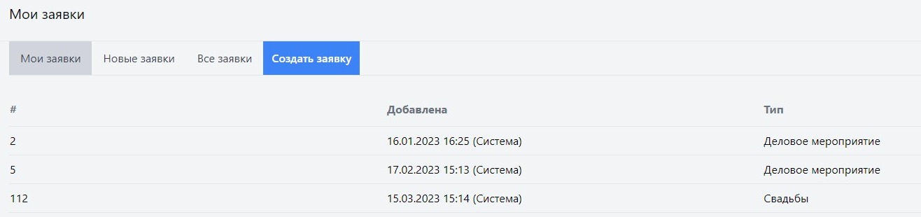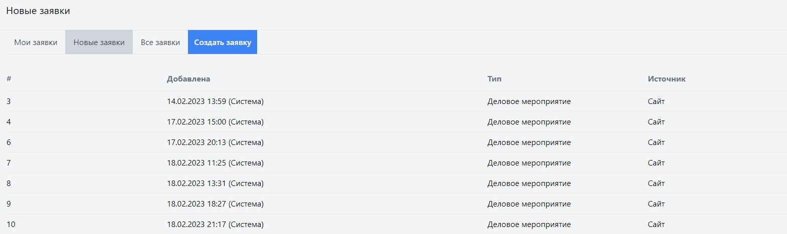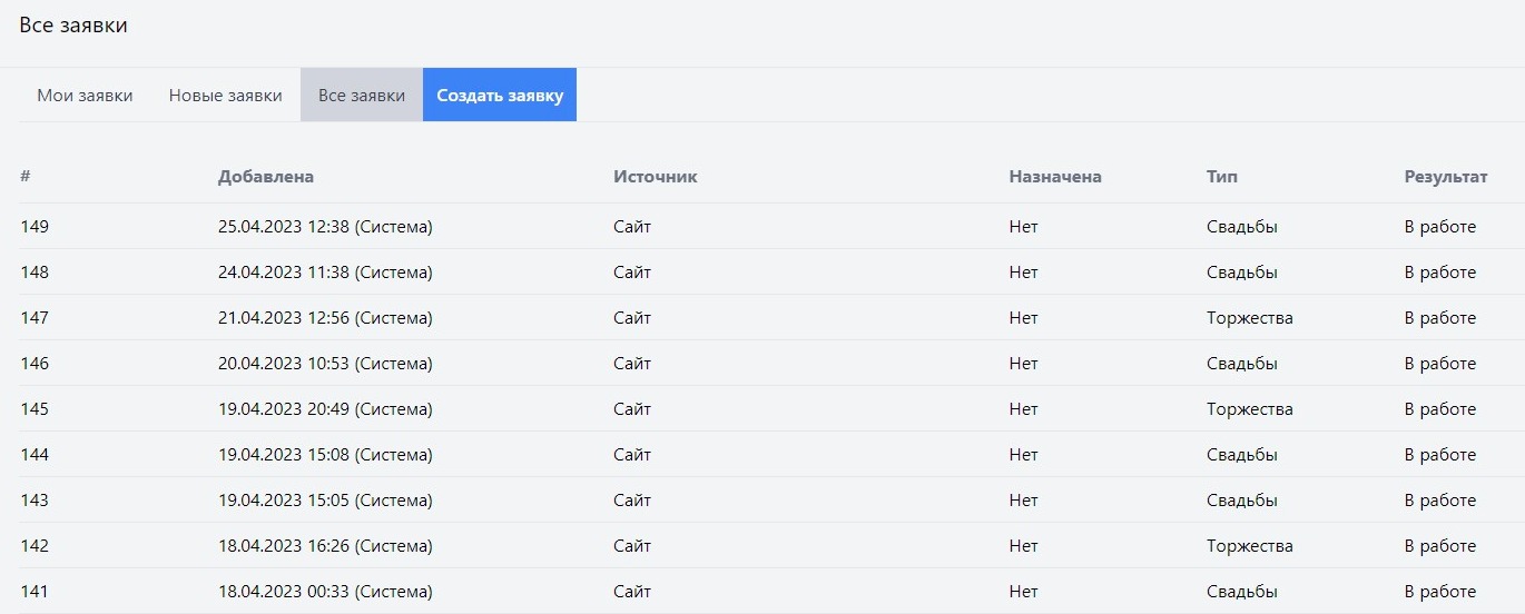 В разделе "Все заявки" отображается полный список поступивших заявок, с указанием: