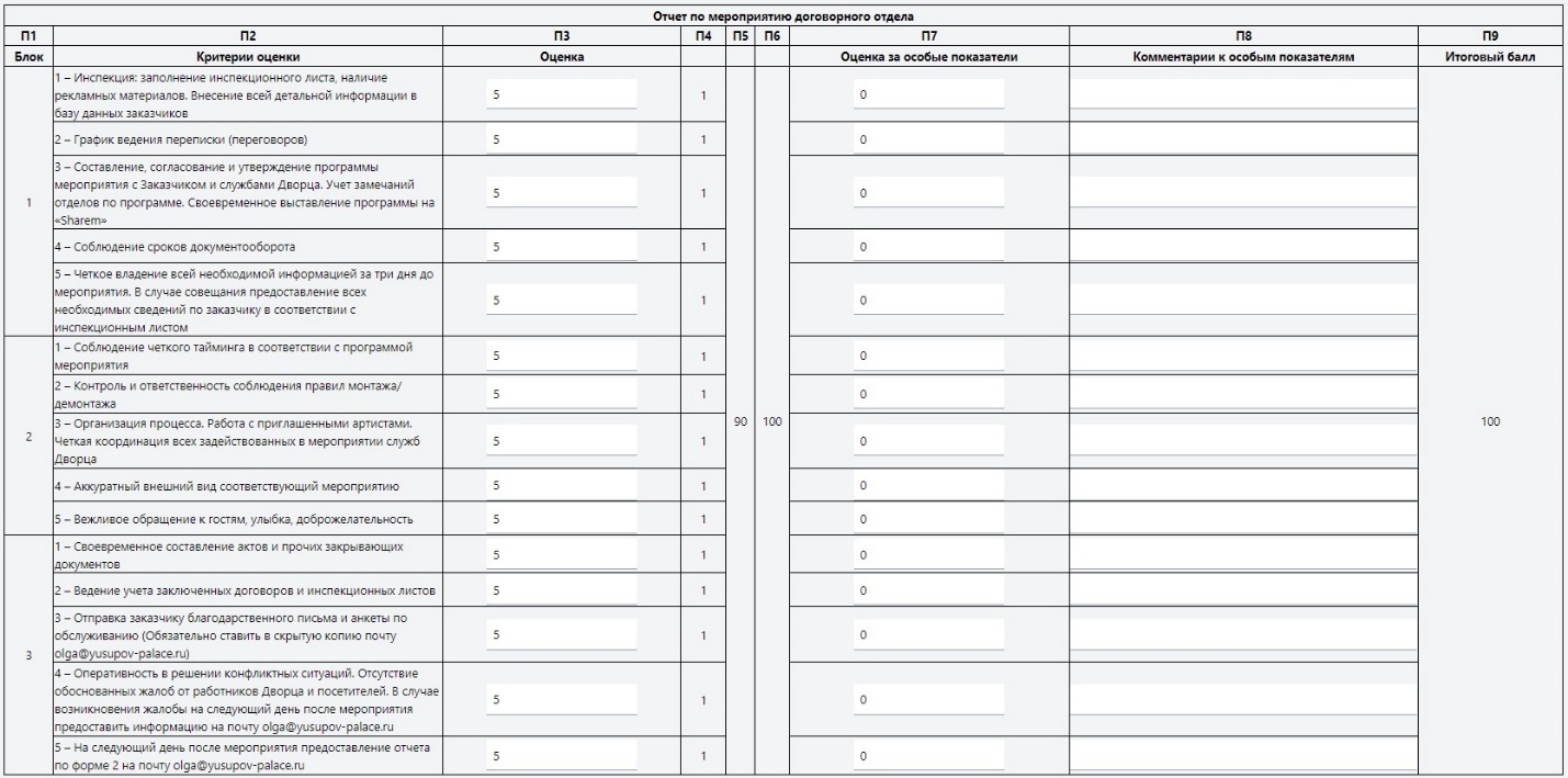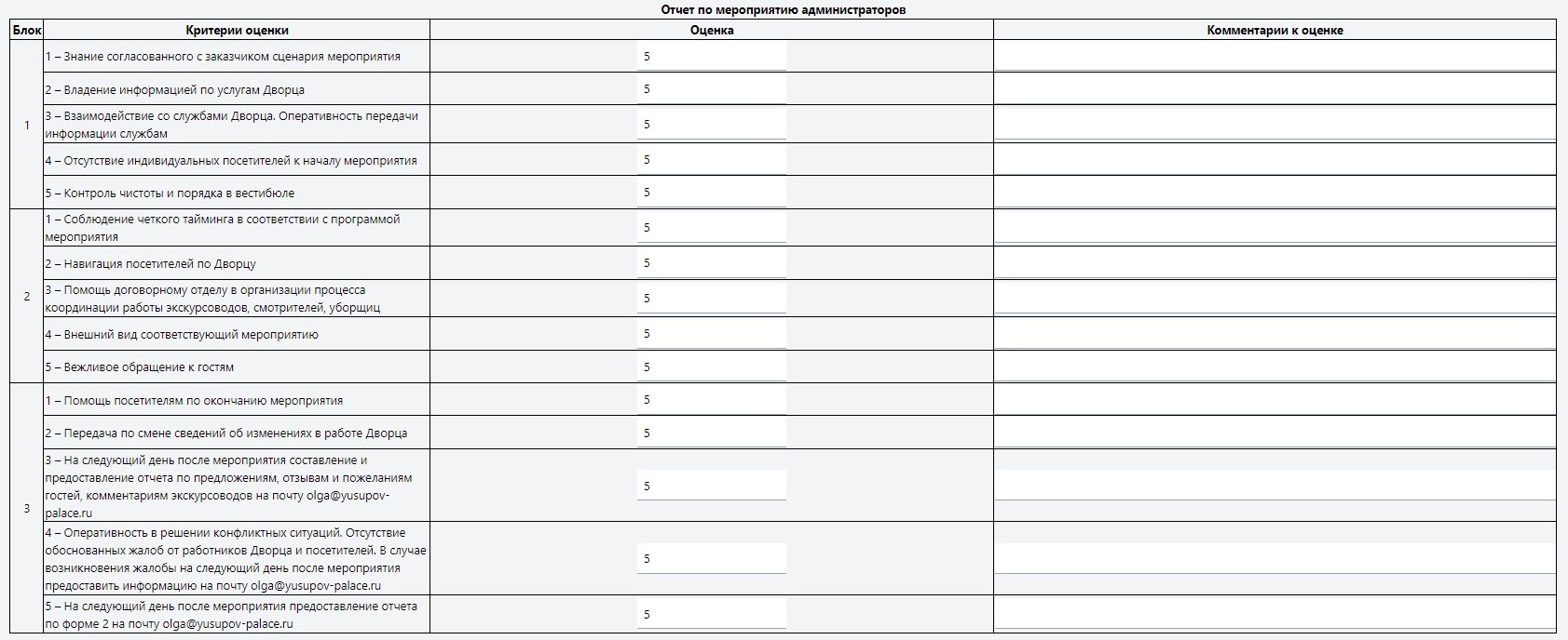 В дополнительных таблицах, которые расположены ниже, пользователь оценивает работу всех остальных отделов на мероприятии. Здесь доступны только поля "Оценка" и "Комментарии к оценке". В них можно ничего не менять, если претензий к другим отделам у пользователя не возникло.