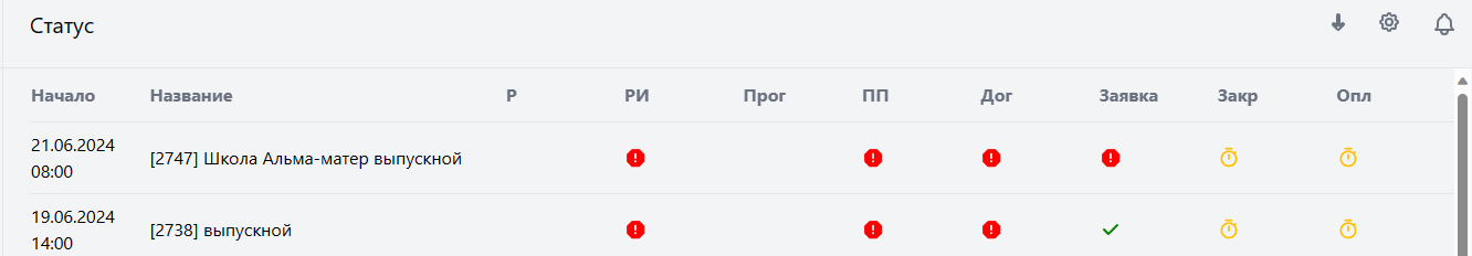 Раздел предназначен для наглядного отображения статусов мероприятий. Раздел имеет общий с календарем фильтр данных.
