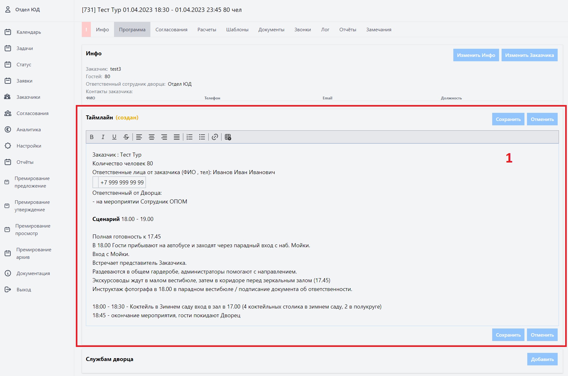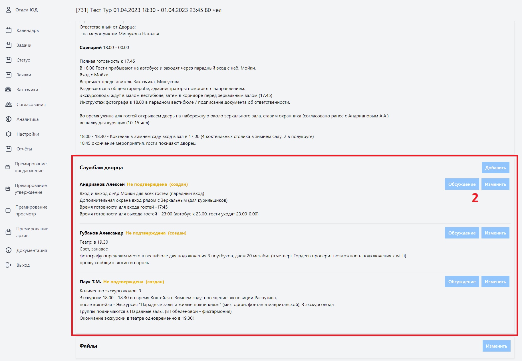 Раздел в котором подробно расписаны задачи на мероприятие для конкретных отделов Юсуповского дворца.