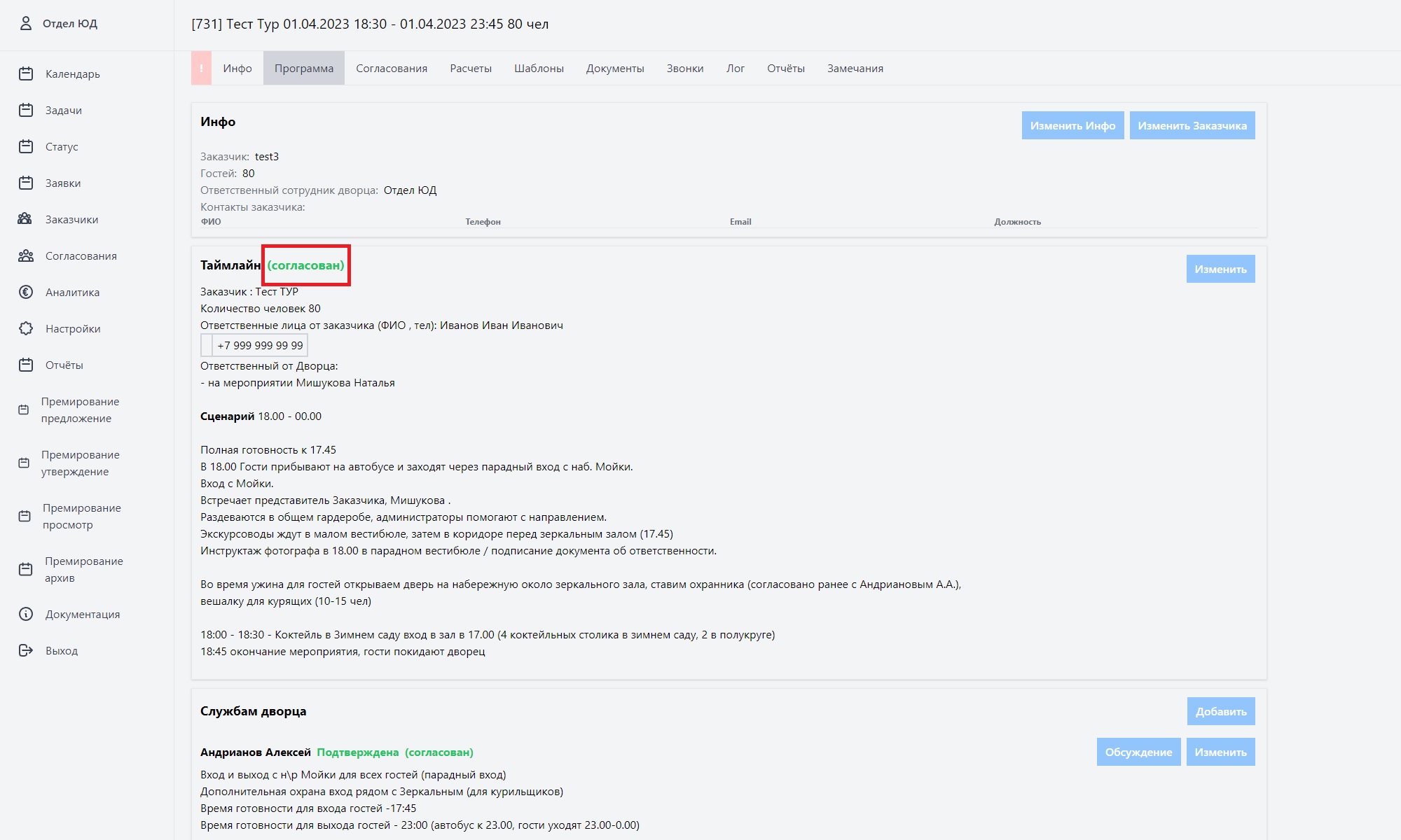 После того как все задачи подтверждены отделами (в случае необходимости отредактированы и согласованы), таймлайн программы полностью написан, заполнена вся информация о мероприятии - наступает процесс согласования общей программы мероприятия.