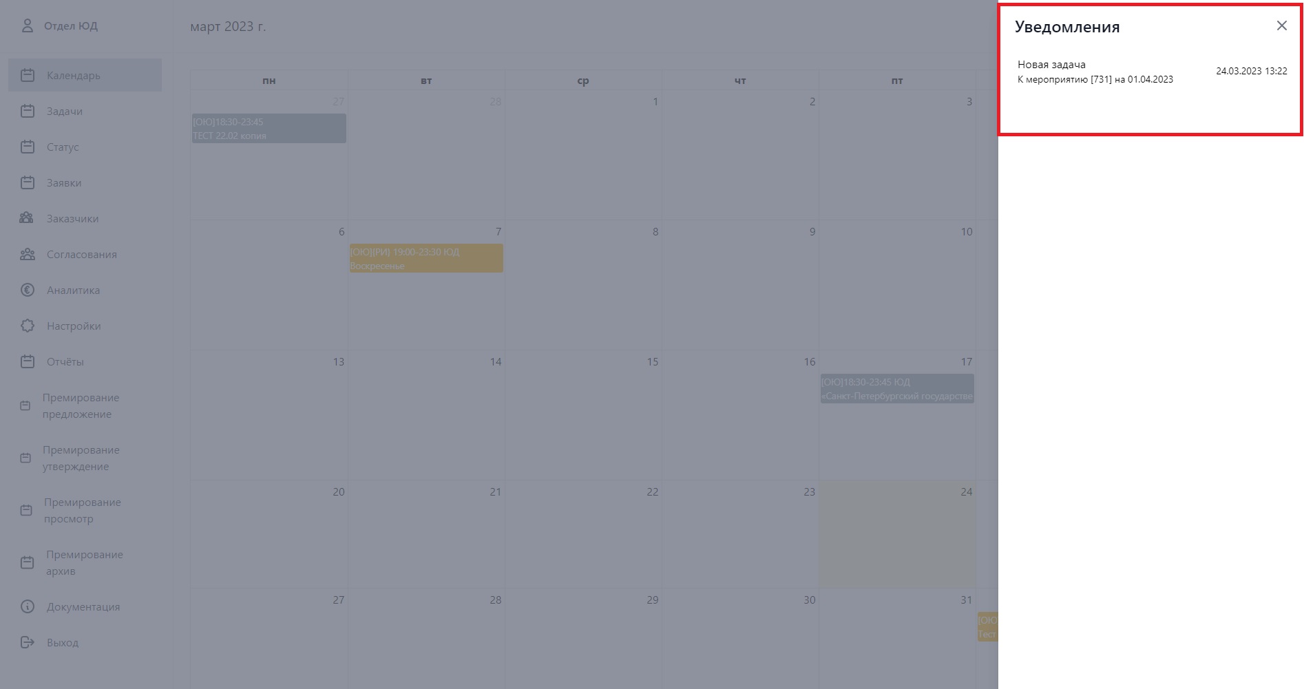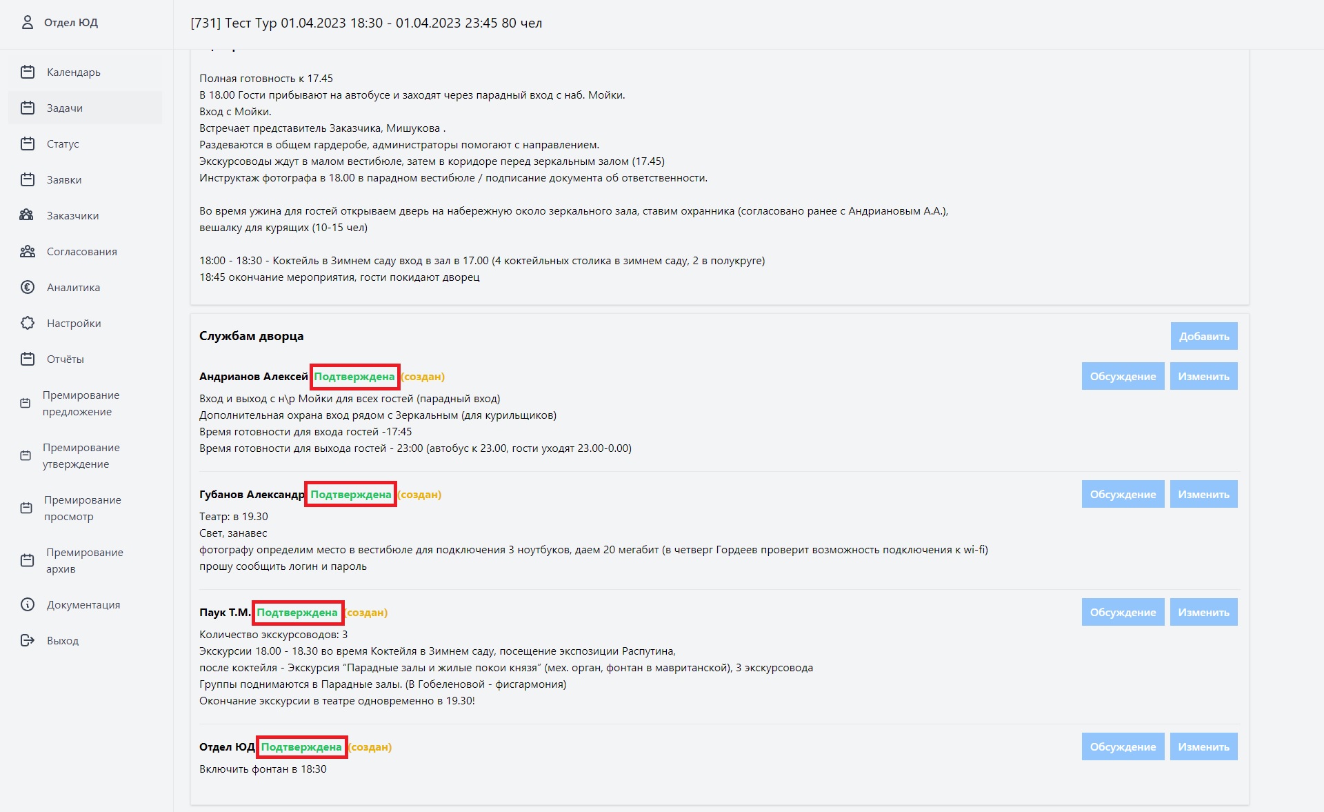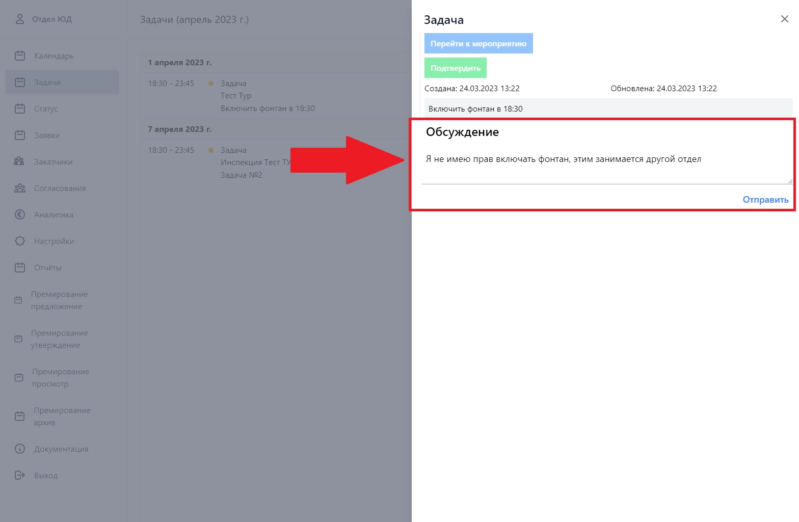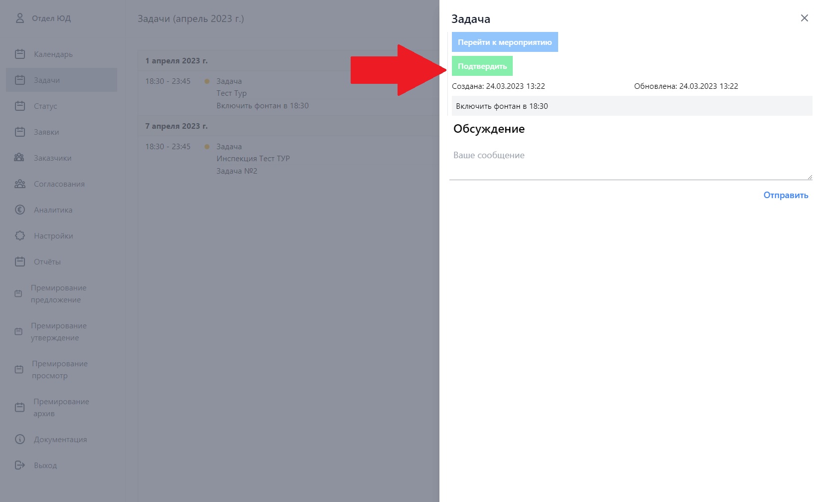 После получения новой задачи по предстоящему мероприятию сотрудник отдела должен отреагировать на поступившую задачу. Если задача ясна и не вызывает вопросов то нажимает кнопку «Подтвердить».